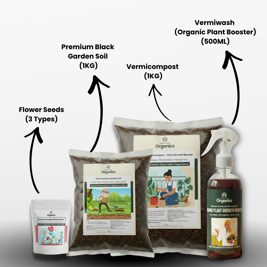 The Flower Garden Combo by Budget Friendly Organics is designed for home gardeners who want to grow colorful flowers easily. This combo helps prepare healthy soil, supports plant growth, and includes popular flower seeds suitable for Indian growing conditions.